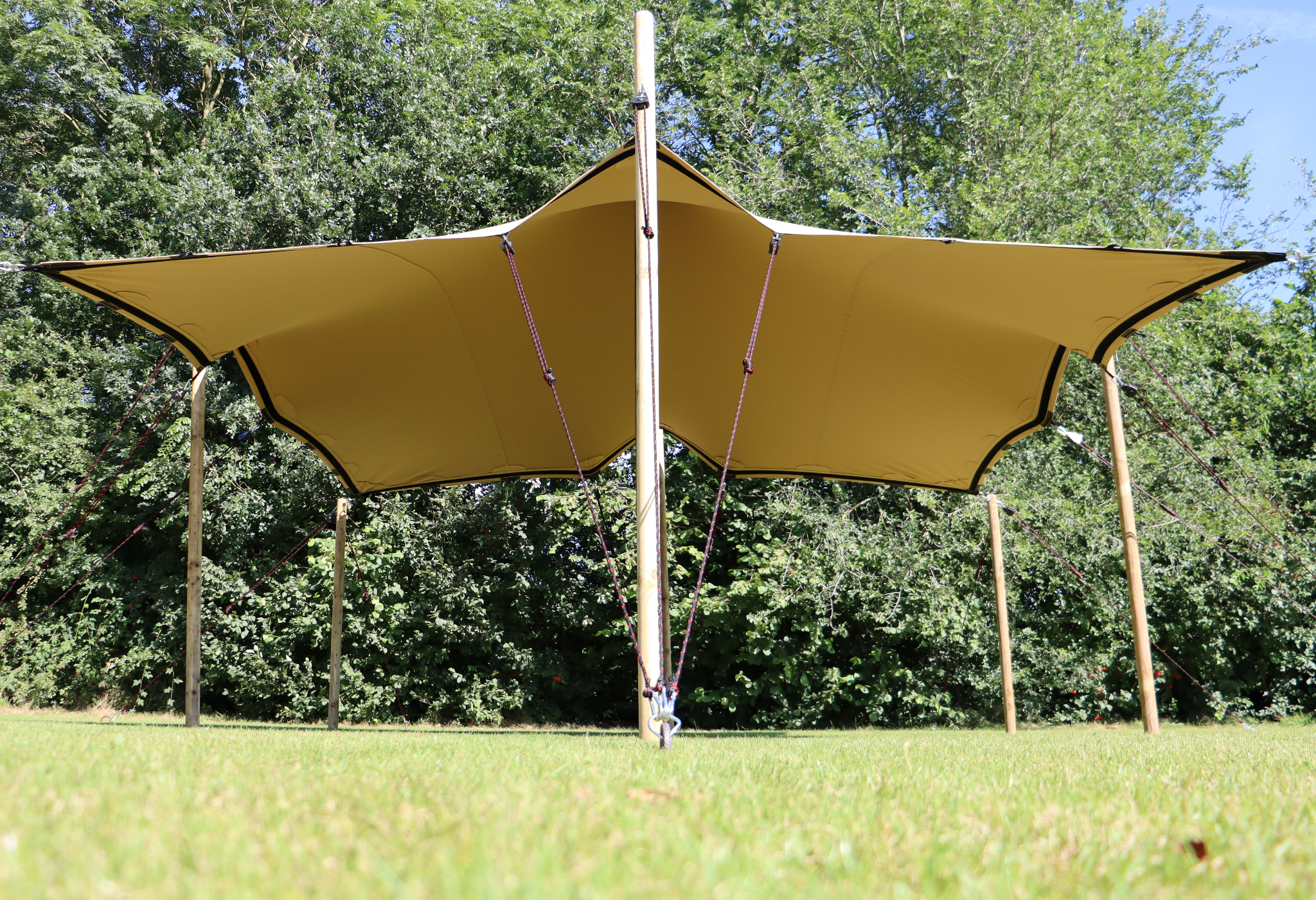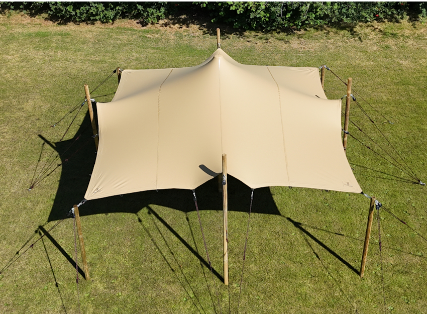 Give your event, party, patio or garden a summer and Mediterranean touch with this 5.0 x 5.0 m stretch tent, also known as a nomad tent. Thanks to the high-quality stretch fabric (720 g/m²) and the included poles, you can customize its configuration: in good weather, you can set it up with all four sides open; with wind, with one or more sides closed; and in the rain you can drive it almost completely closed. The bigger the tent you have, the more possibilities you have.