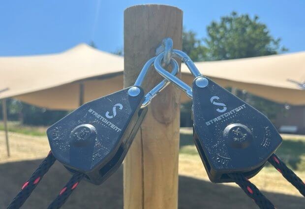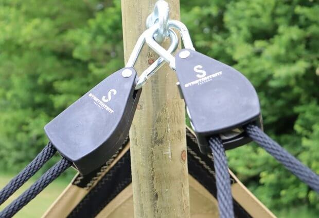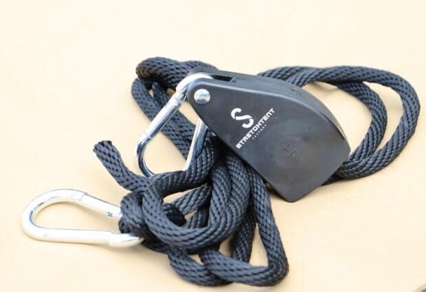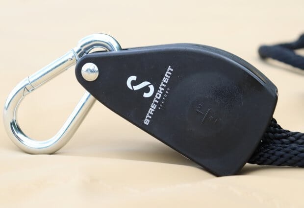 The Rope Ratchet tensioner (1/2″) contains two carabiners and 400 cm of rope. Each has a tensile strength of 250 kg. In short, it is indestructible.